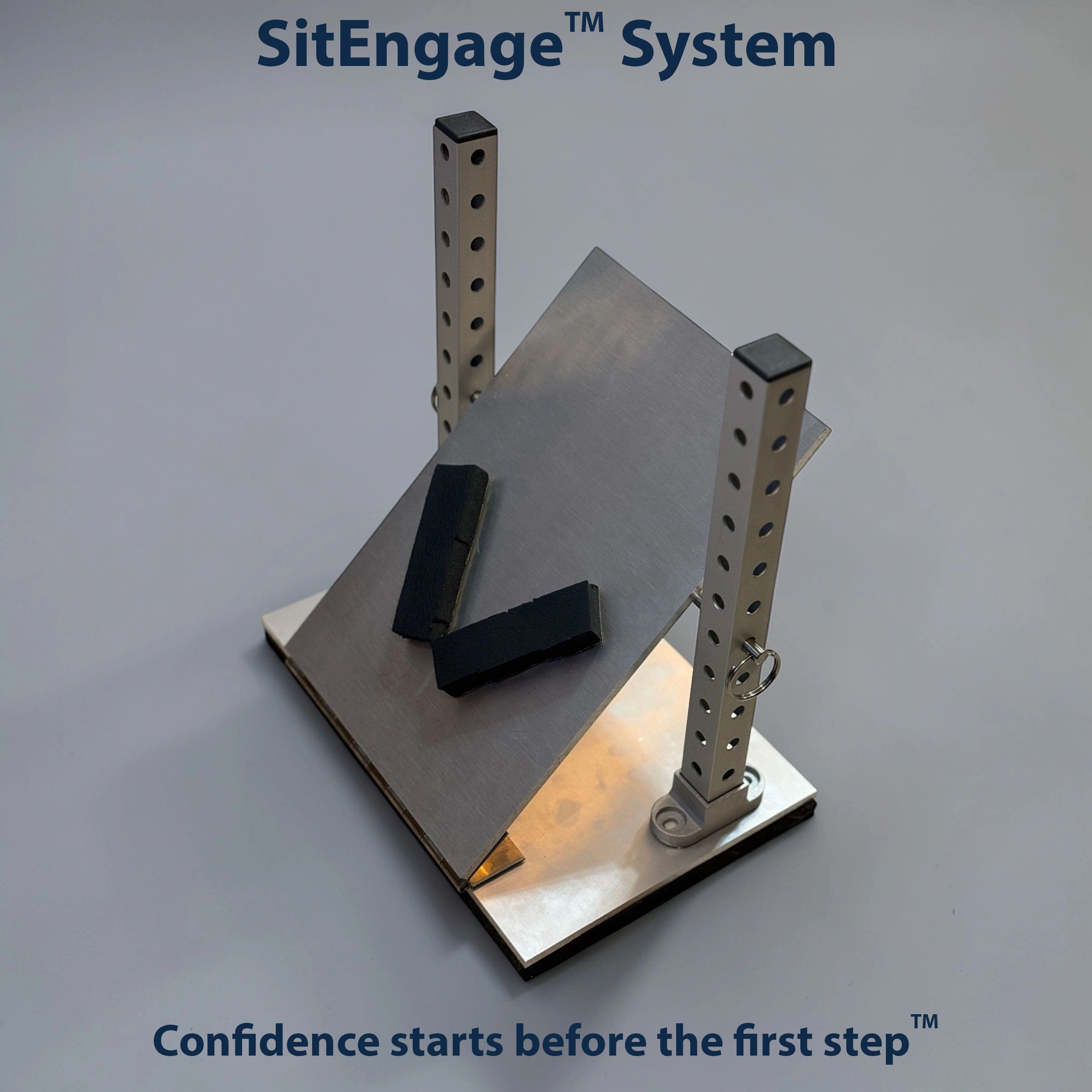 Introducing a patent-pending portable assistive platform designed for controlled alignment during seated prosthetic donning.